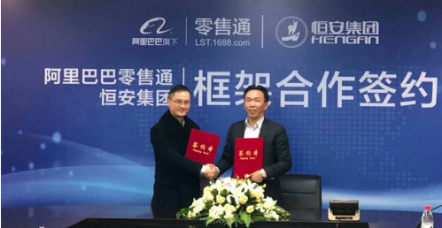 阿里巴巴集团副总裁、零售通事业部总经理林小海(左)与扑克之星集团运营中心总裁许水深(右)签订战略合作协议